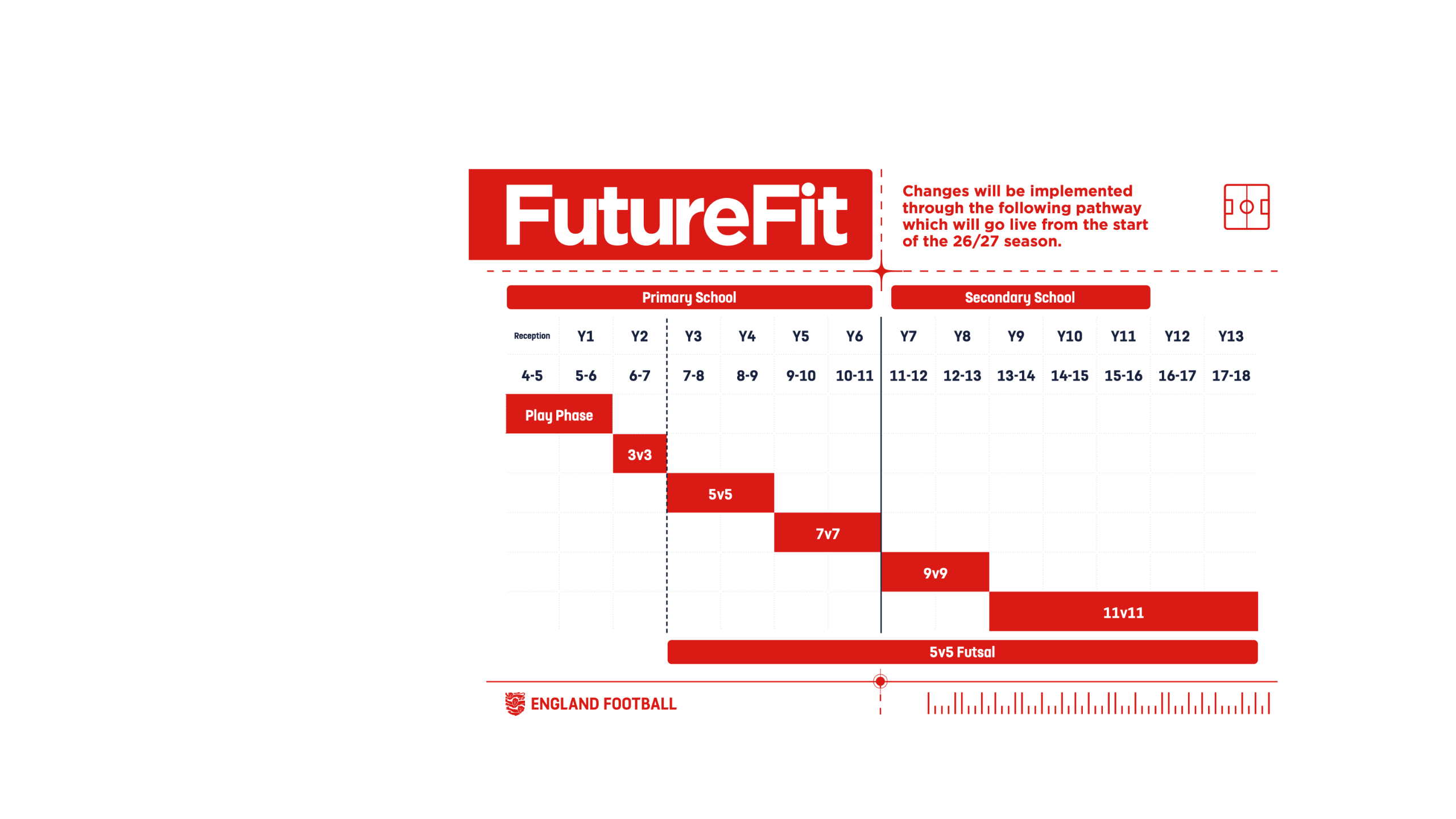 This includes the introduction of a new 3v3 at Key Stage 1, and the introduction of 9v9 and more complex rules as children progress to Key Stage 3 and secondary school.